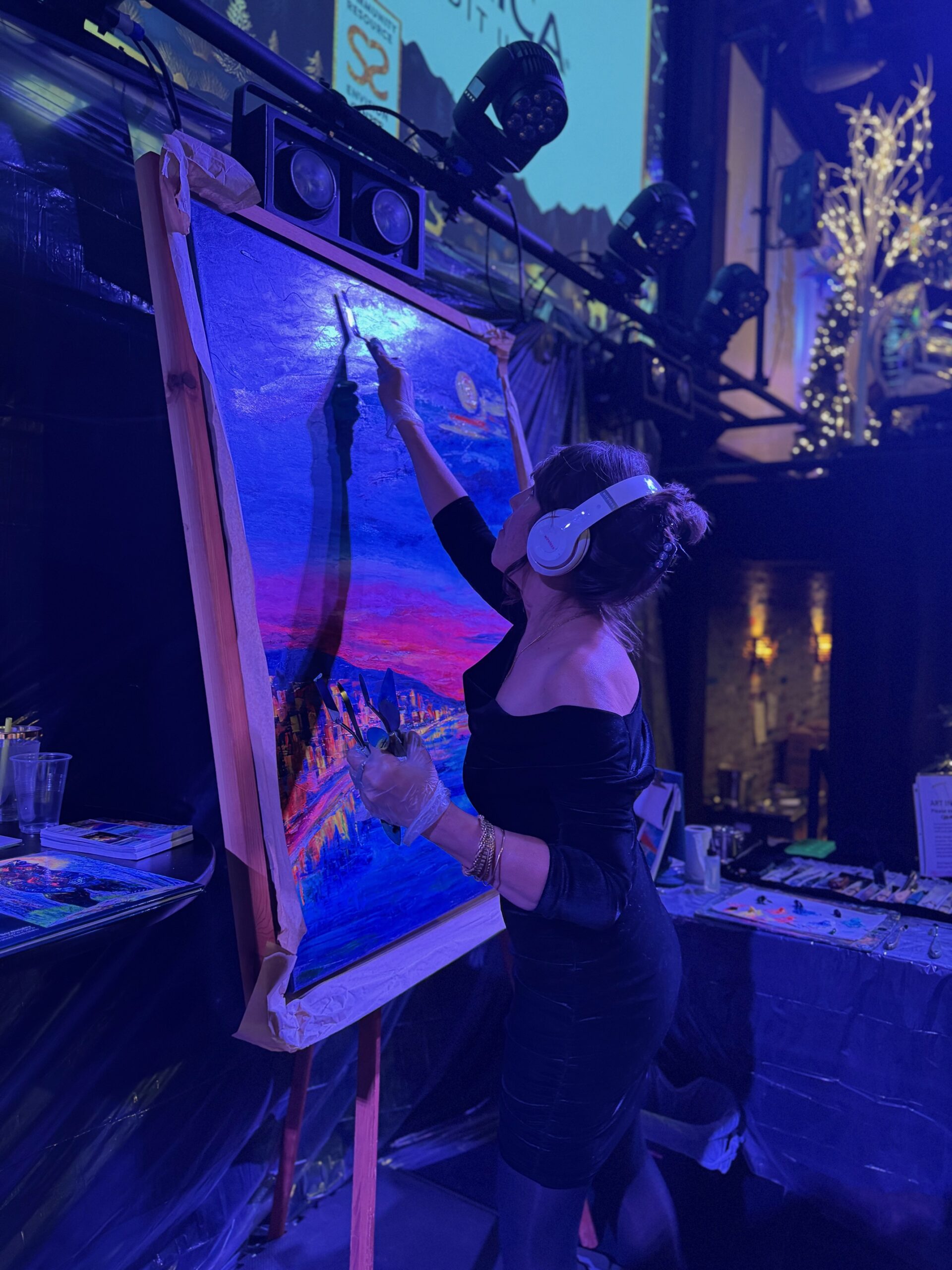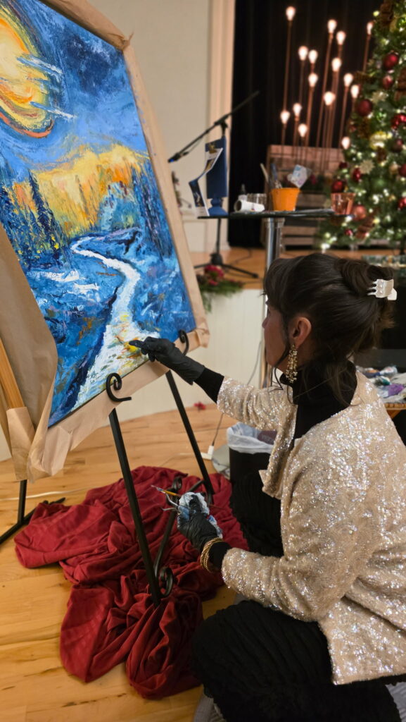 During the gala, Heather live-painted City on a Hill, inspired by the 12 Days of Giving and the belief that when generosity and faith come together, light multiplies. The piece reflects the mission of IdaHope Families—supporting resources that help families stay together—reminding us that shared acts of giving create something radiant, hopeful, and lasting.