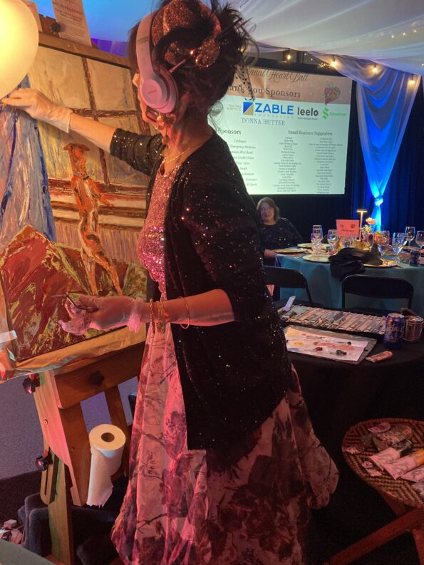 Heather’s live paint fundraisers transform an event into a shared moment of creativity and generosity. Over the course of about two hours, she creates a painting in real time as guests watch the piece come to life and the energy of the room builds around it. The finished artwork is then auctioned, with the proceeds supporting the host’s fundraiser as well as her nonprofit, WellConnected, allowing one painting to support two meaningful causes.