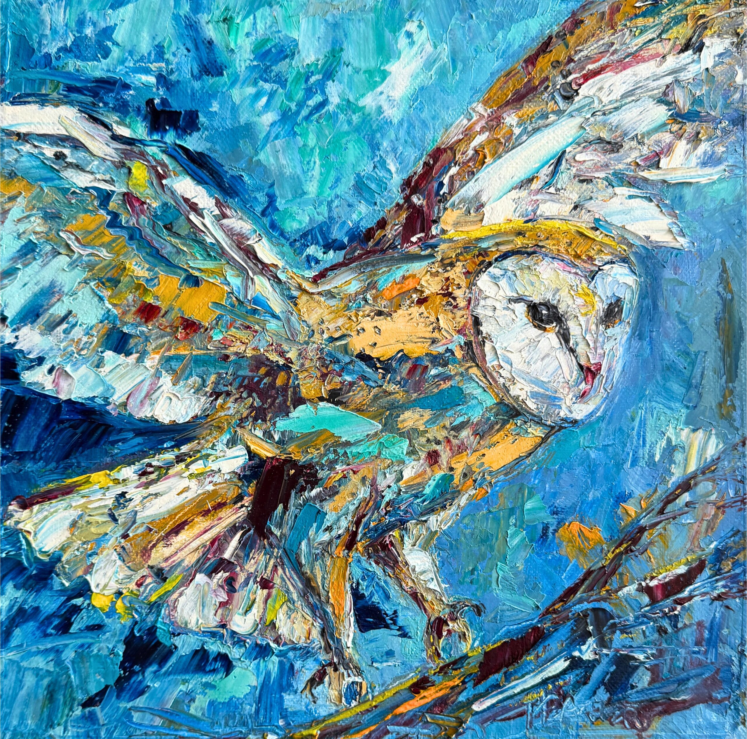 I stumbled upon this spotted frame and instantly saw motion — wild air, feathers rustling, a landing in progress. I painted Coming in Hot to fit the energy already living in the frame. This barn owl is captured just as it’s braking in flight, wings arched, talons ready, moments from perching on a weathered branch. The turquoise, yellow ochre, and phthalo blue slice through the air with seafoam green and white lifting the feathers into light.