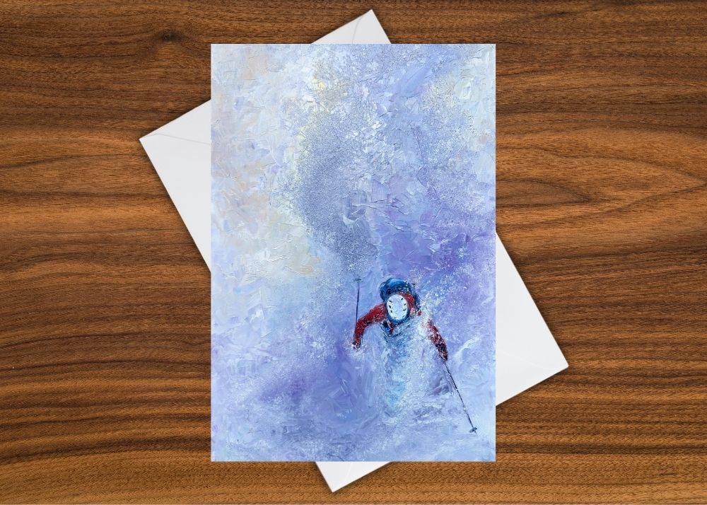 From the Lift captures that breathtaking view from above — that split second when you’re looking down through a swirl of snow and motion, watching a skier carve through deep powder. Seen from the top of his helmet, he’s not just gliding but flying downhill, swallowed by a rush of white. Lavender and prism-blue shadows ripple across the slope as the snow billows up like a soft cocoon, wrapping around him in a blur of speed and silence. It’s that suspended moment you witness from the chairlift — when the world feels weightless, and the mountain below becomes a living painting of motion, energy, and freedom.
