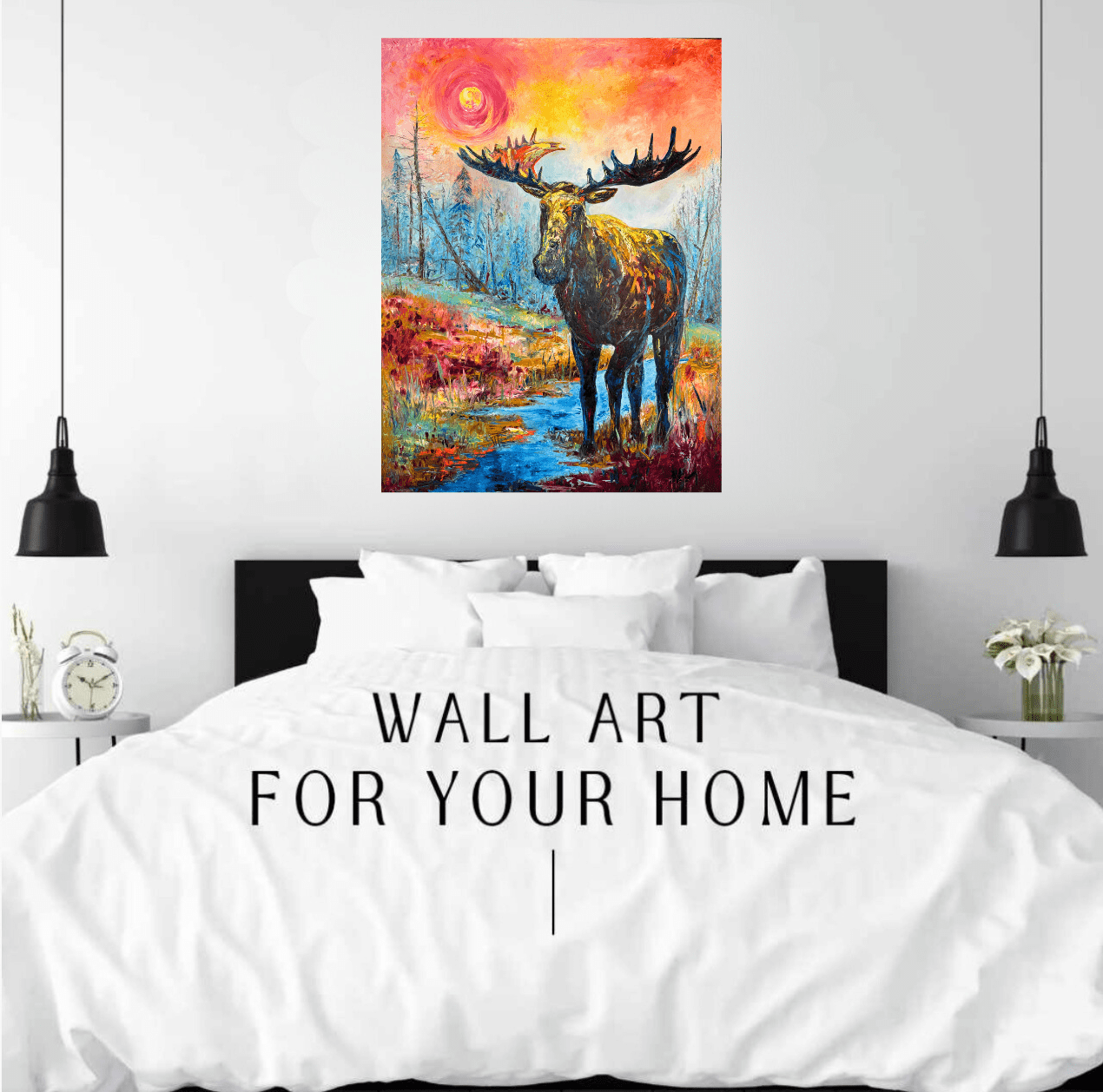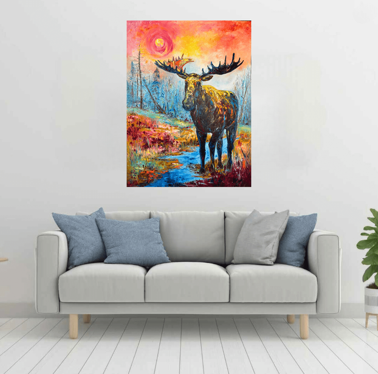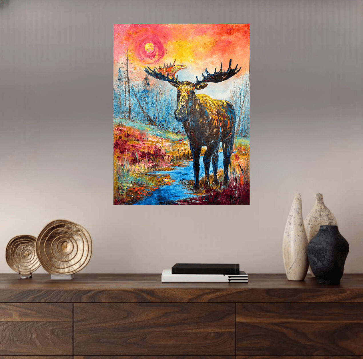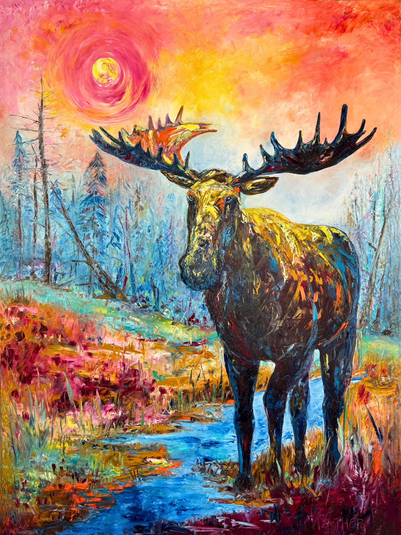 At nearly life-size, Gill’s Guardian stands watchful and serene in a marshy Idaho creek at sunset—its moose subject glowing in hues of pastel pink, ember orange, and cool blue. The haunting silhouettes of scorched trees rise like smoky spirits in the background, a subtle nod to the wildfires that have reshaped these mountain ranges. Commissioned by Kim and Eric Gill of Golden Eagle Ranch, this work was painted on an 8×6-foot framed canvas—the scale chosen deliberately to match the majesty of its subject—the moose becomes a silent sentinel, a totem of presence and protection. This piece honors the resilient, watchful spirit of the Idaho wilderness and, fittingly, now serves as a symbolic guardian for the Gill family.