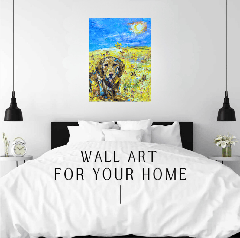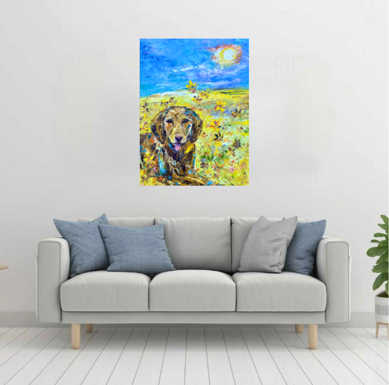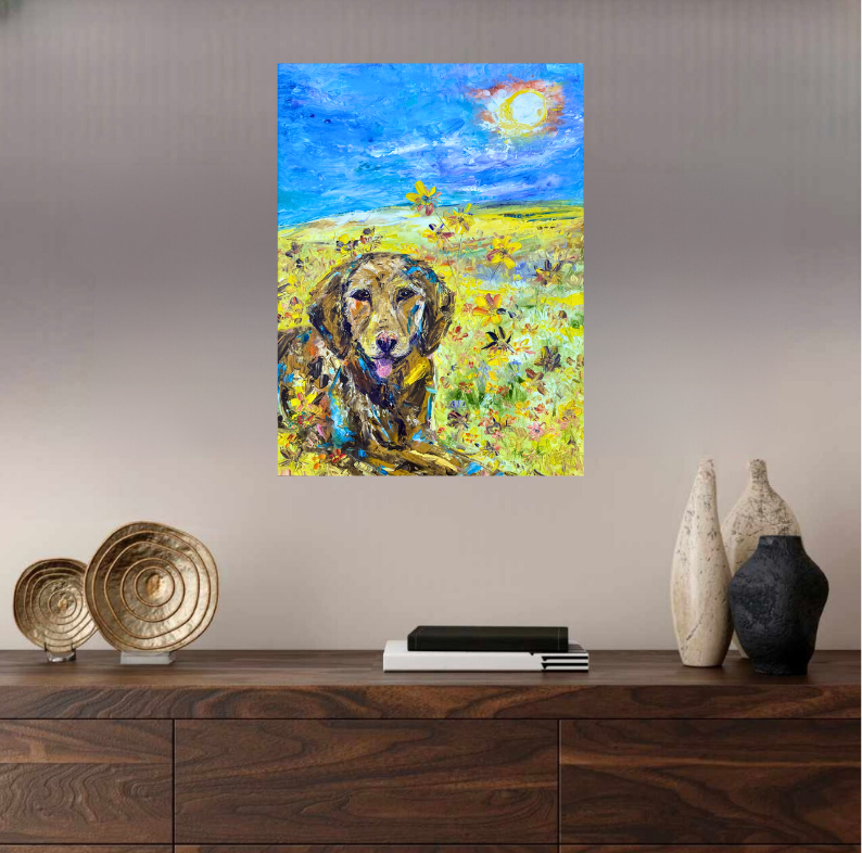This painting celebrates Ritchie, John’s beloved golden retriever-lab mix, who carries the name of his dear friend who passed away. John often said his friend had “the same personality as a golden retriever”, loyal, joyful, full of love, so naming his dog Ritchie felt like the perfect tribute. Although this piece wasn’t commissioned, when John shared a photo of Ritchie, I couldn’t help but paint him. Sitting under the sun in a field of daisies and wildflowers, Ritchie shines with the same warmth and light as the friend he was named for. “Heart of Gold” honors not just the bond between a man and his dog, but also the lasting legacy of friendship, joy, and golden-hearted souls who never truly leave us.
