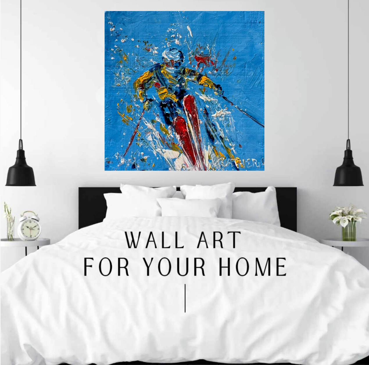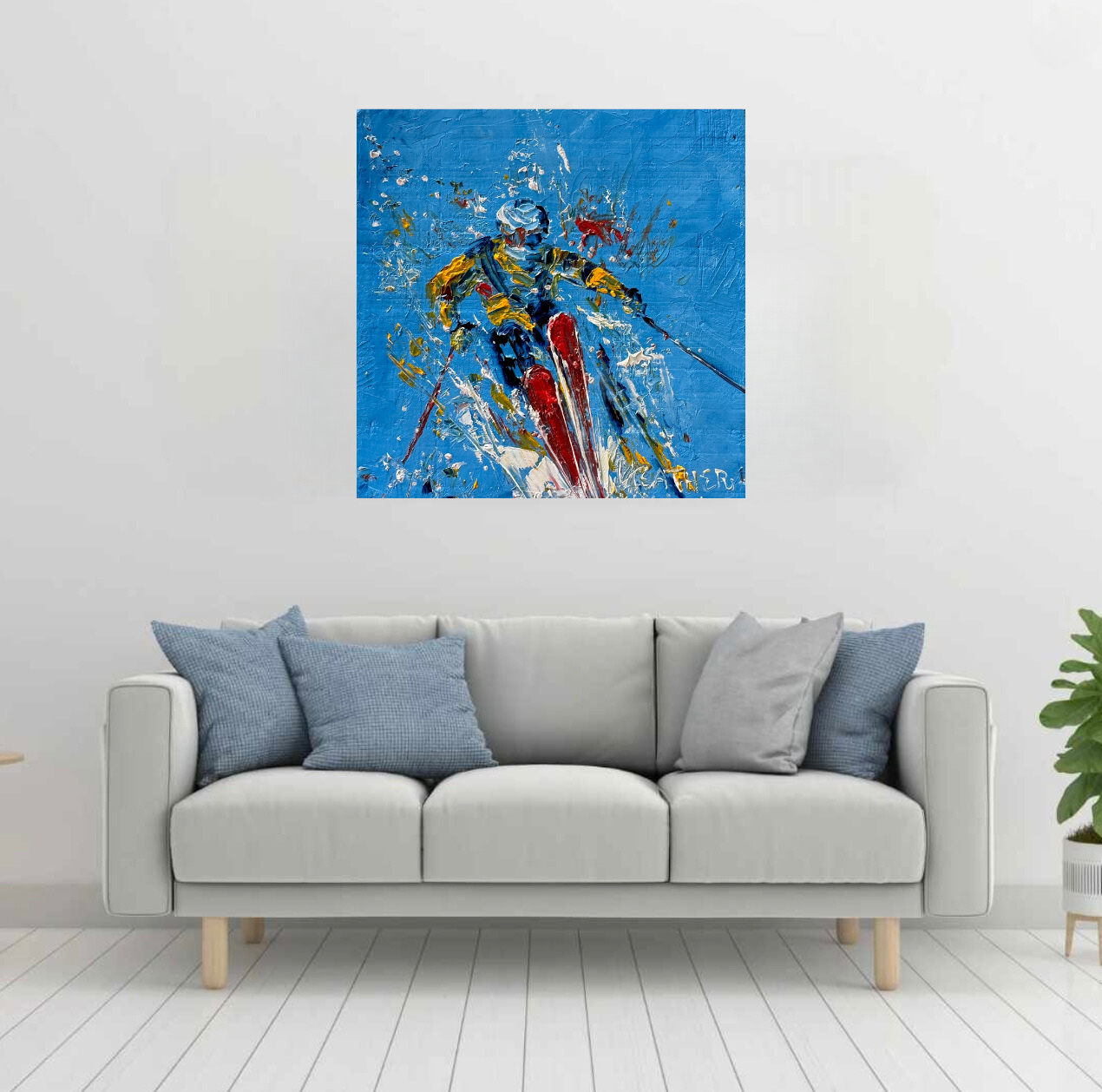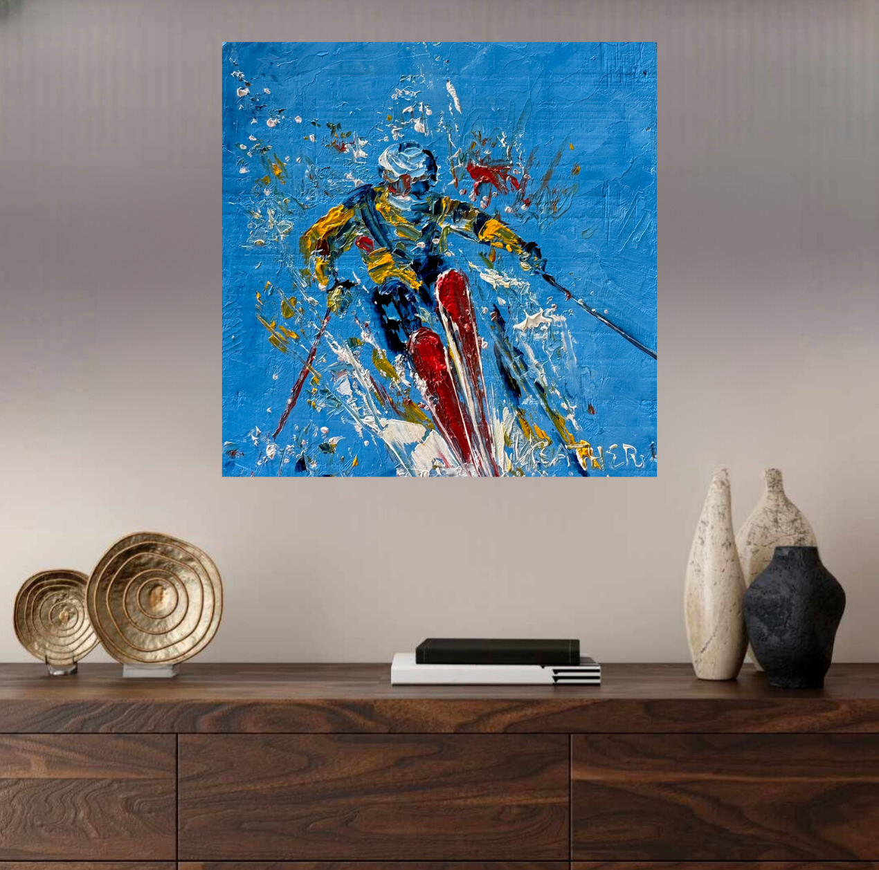 This bold close-up shows a ski racer bursting forward with energy and determination. Painted in bright primary colors, the skier powers through the air, kicking up a spray of colorful snow. The hint of airtime and the racer’s explosive motion capture the thrill of the moment as a winner emerges. This piece is full of excitement and the unstoppable drive of a true competitor.