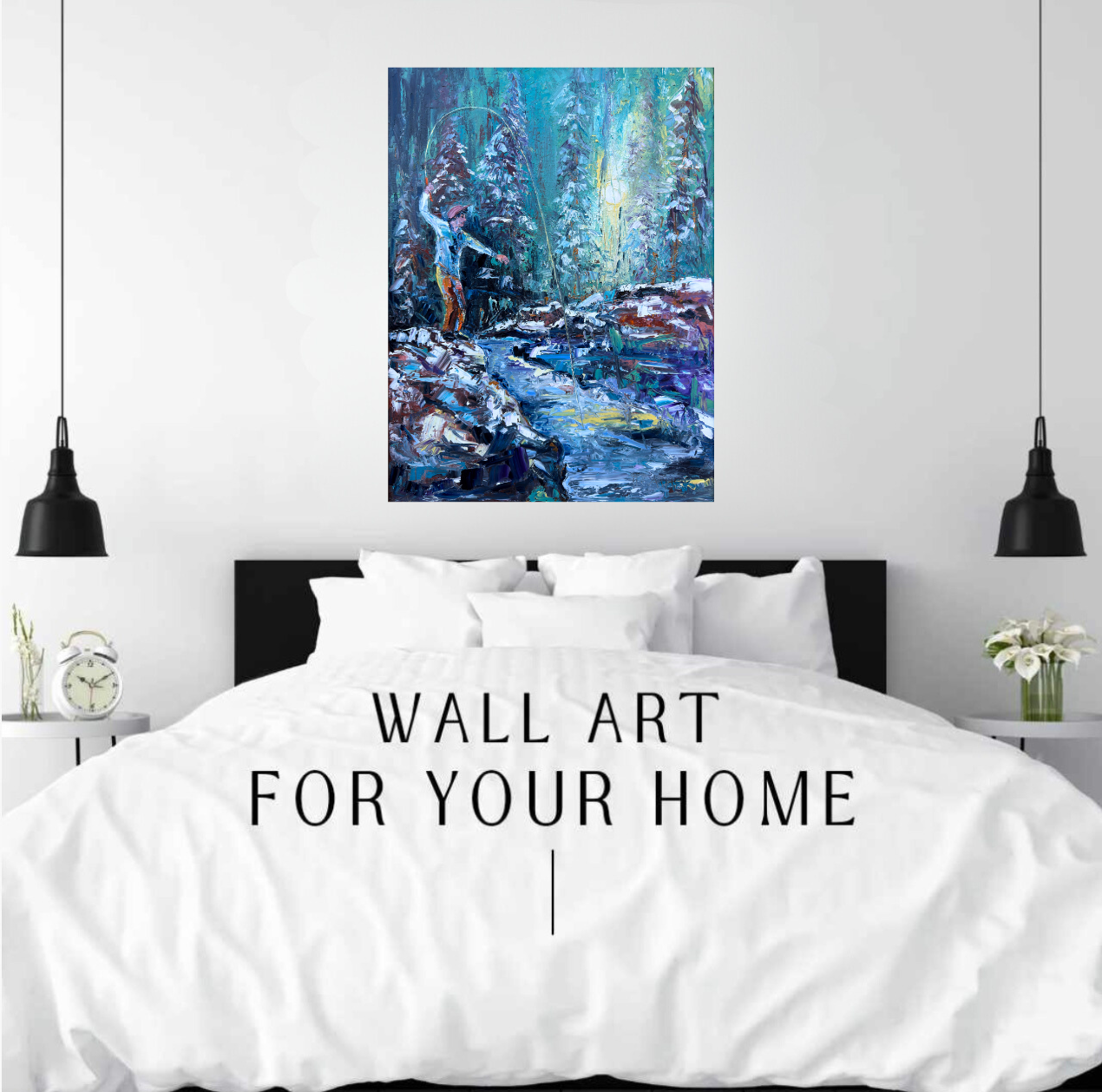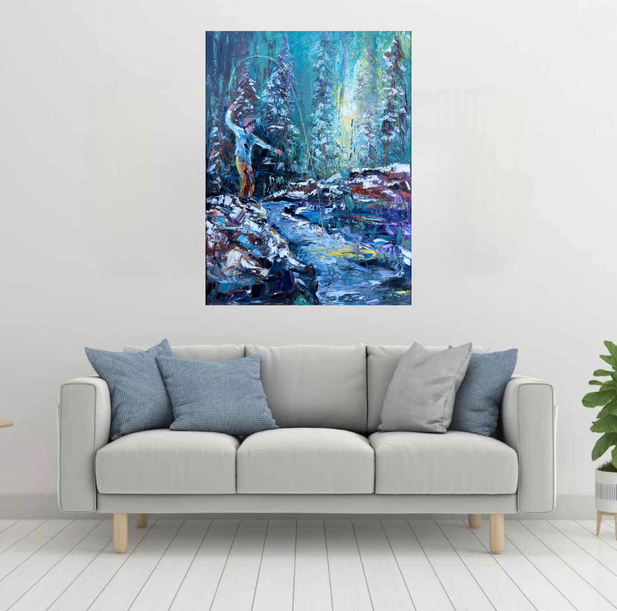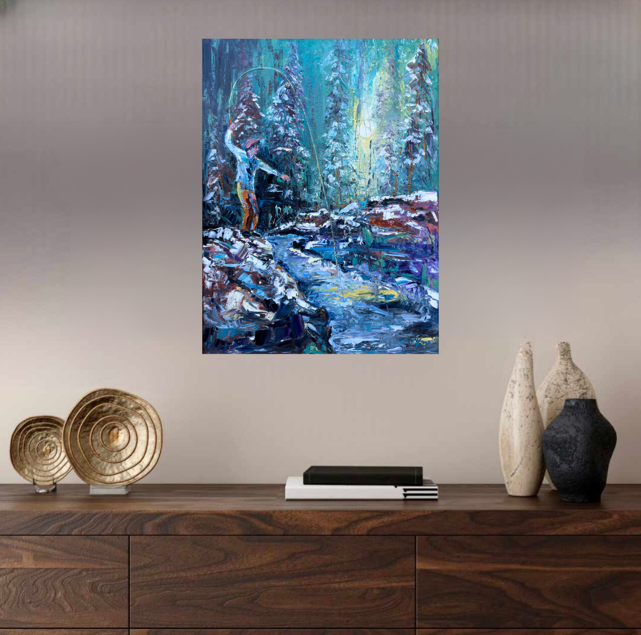 John commissioned me to paint this piece, wanting a fly-fishing scene in winter rather than the usual summer warmth. I pictured him standing on a rock in a quiet creek that winds through dark evergreens, its edges crusted with ice and dusted in titanium white. The palette is strong and moody—evergreen and Prussian blue layered with the hush of winter. His 7’6” bamboo rod bends against the pull of a hidden lunker, just beneath the surface where a flash of pale light hints at its presence. Sunlight filters through the woods, scattering across the water in ethereal reflections, turning this cold, solitary moment into one of quiet reverence and nostalgia.