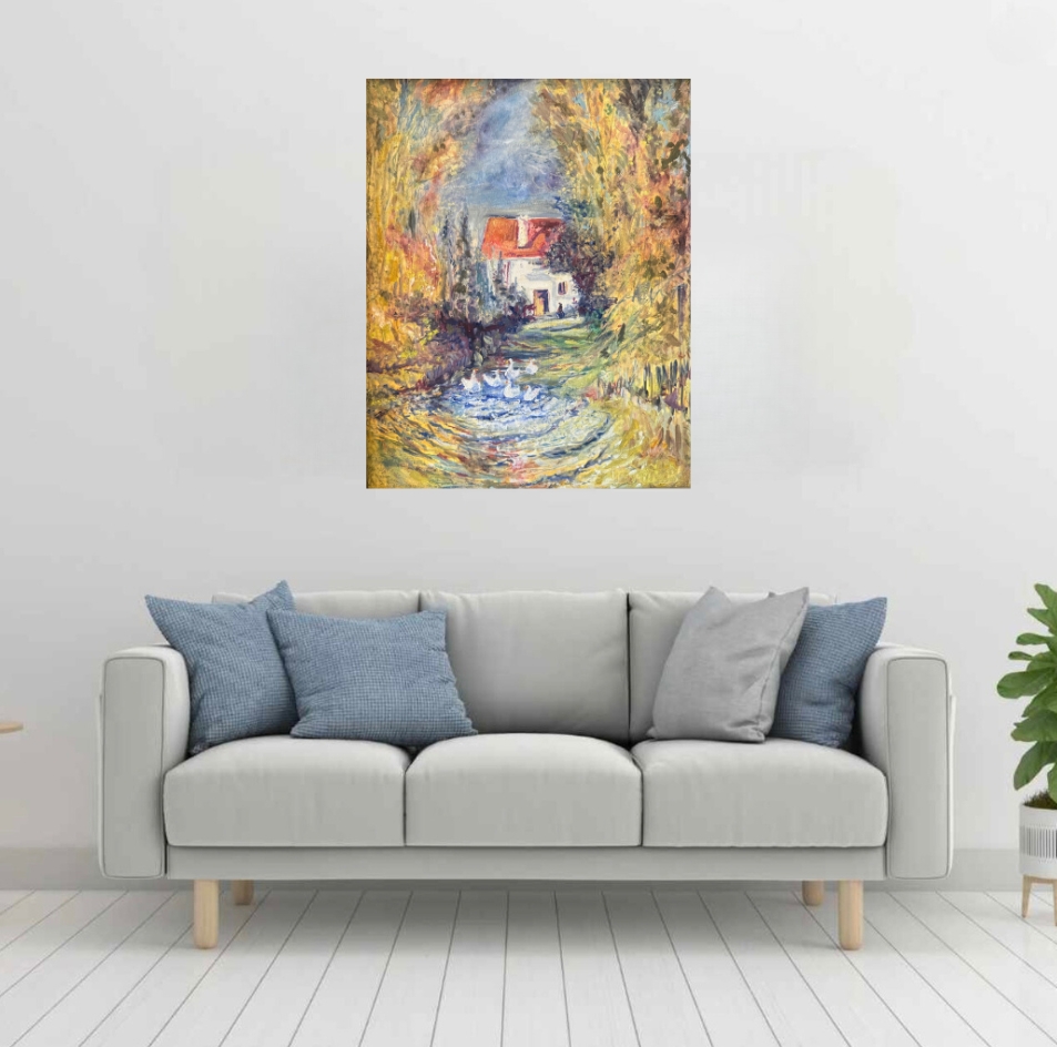 Monet’s Ducks is a study I painted during a special mother-daughter trip to France for my 60th birthday. My daughter Rio booked me a studio in Aix-en-Provence, and every morning, she walked me to class through the narrow cobblestone streets—our own sweet switch of roles. At the Leo Marchutz School of Painting and Drawing, I took my first-ever formal art class since earning my Fine Arts minor degree in college. As part of the assignment, I chose Monet’s Duck Pond from 100 master paintings to recreate in my style. Its circular composition and autumn colors reminded me of my childhood in Bucks County and the weathered barns of Idaho. Though I normally prefer the freedom of palette knives over the slow work of brushes, this experience taught me to pause, study the light, and mix color with intention. My version of Monet’s Duck Pond captures the quiet reflections and gentle movements of the ducks—echoes of that special time with Rio and the joy of learning together.