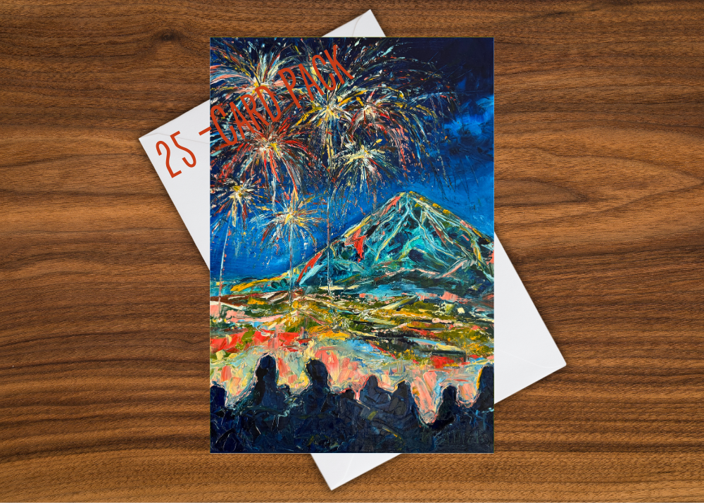 A celebration of color and community, this painting transforms a mountain village into a stage of light and wonder. Vibrant bursts of fiery red, sparkling gold, and electric blue arc across the night, illuminating the silhouettes of gathered families, friends, and travelers marveling at the kaleidoscope of light bursting overhead. The familiar slope of a ski mountain rises in the distance, iconic and still beneath the swirling sky. The painting captures a fleeting moment where nature, tradition, and human connection converge in a colorful display of celebration. Whether winter or summer, it’s a tribute to mountain life at its most unforgettable.