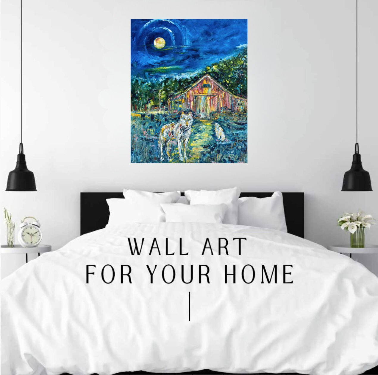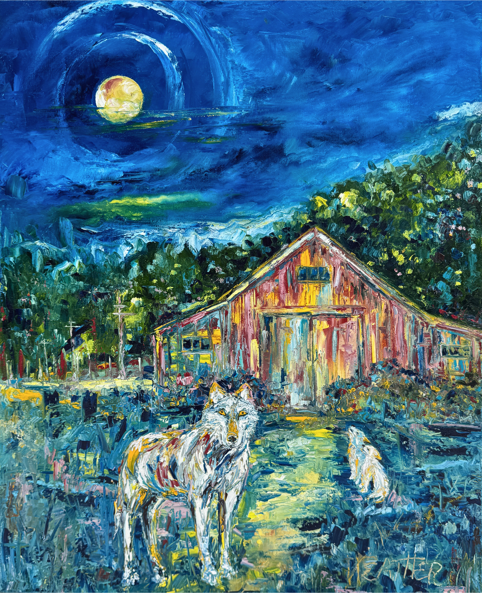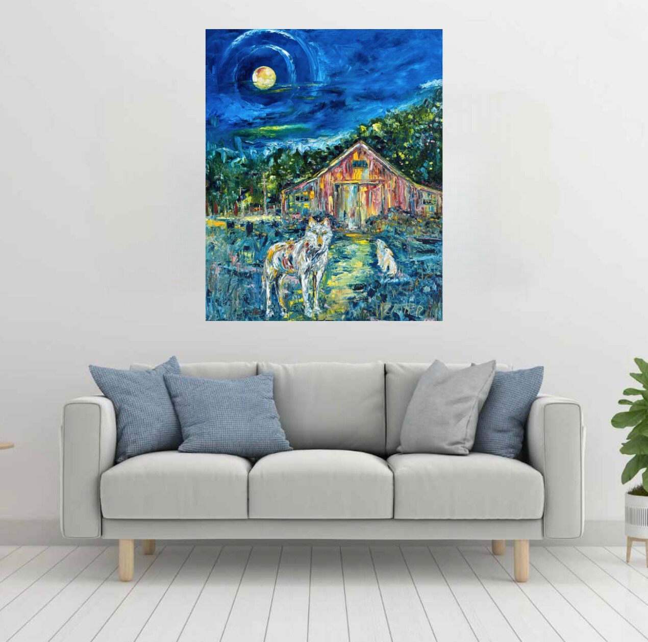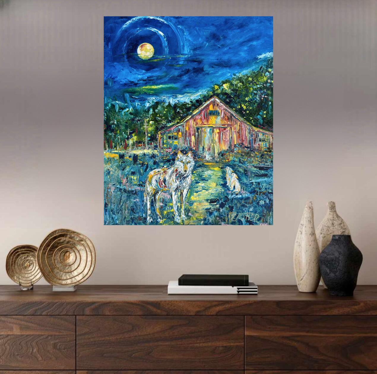 The mother wolf anchors the composition, planted firmly in the foreground. There’s strength in her stance—protective, proud. Behind her, two pups lift their snouts to the night sky, mid-howl, caught in that perfect adolescent imitation of belonging to something bigger. One is a soft, dreamlike blue—the other, smaller and bright as moonlight.The backdrop almost steals the scene: an old, forgotten barn leans into the landscape, full of character. Its wide doors and broken windows hint at stories long past—a relic of human presence in an otherwise wild moment. Once purposeful, now it just holds memories. I layered the textures thick—the moon glows, the barn peels with age, and the wolves feel alive. It’s a tug-of-war between wilderness and what’s been left behind. I liked that tension: wild life moving forward, and the old world holding on.
