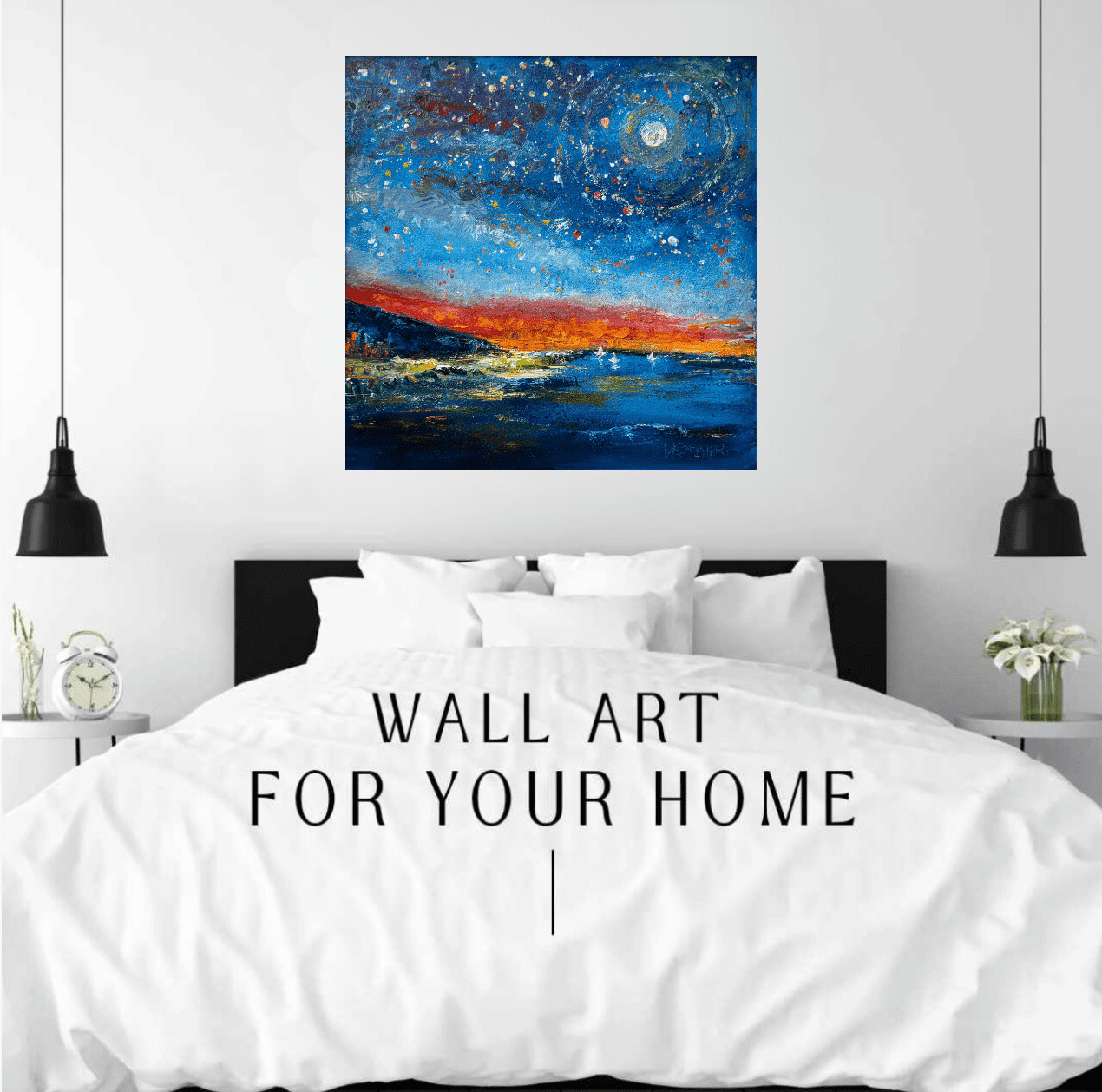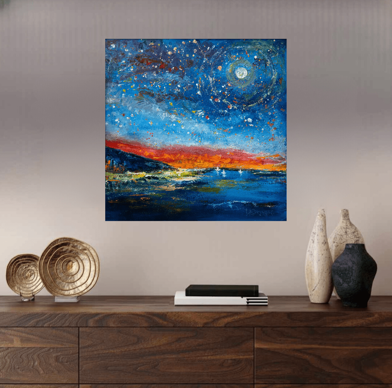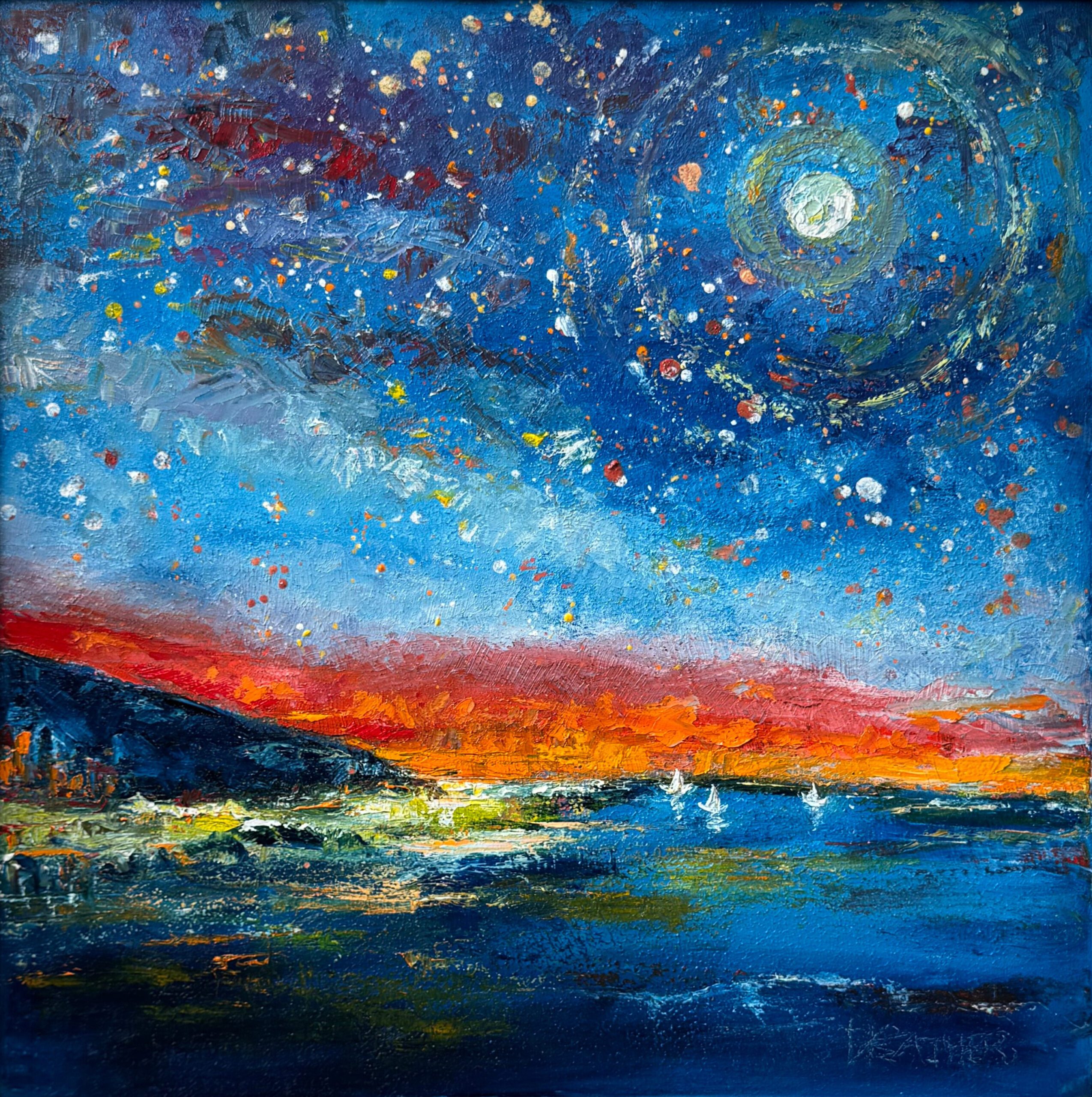 Three boats drift across the water, their sails touched with moonlight. The full moon hangs bright and steady in the sky, its reflection running down the lake toward the viewer. The same mountain ridge continues here, creating unity with the first canvas, but the focus shifts to stillness and movement over water. The hot orange glow lingers on the horizon, dissolving into cool blues and starry space. This painting emphasizes calm, openness, and the rhythm of boats under the moon.
