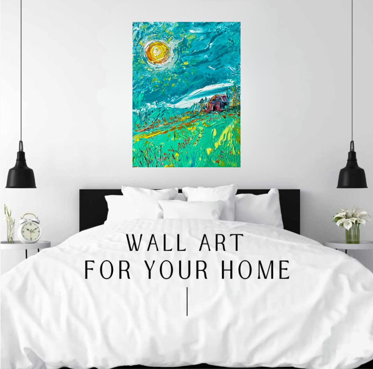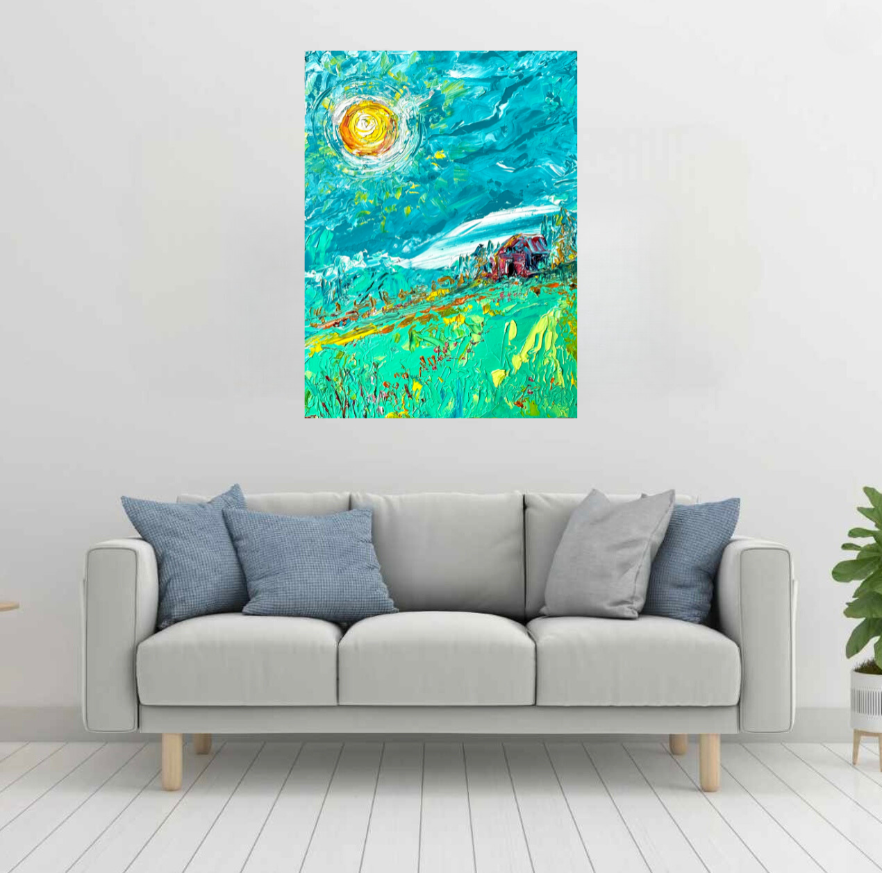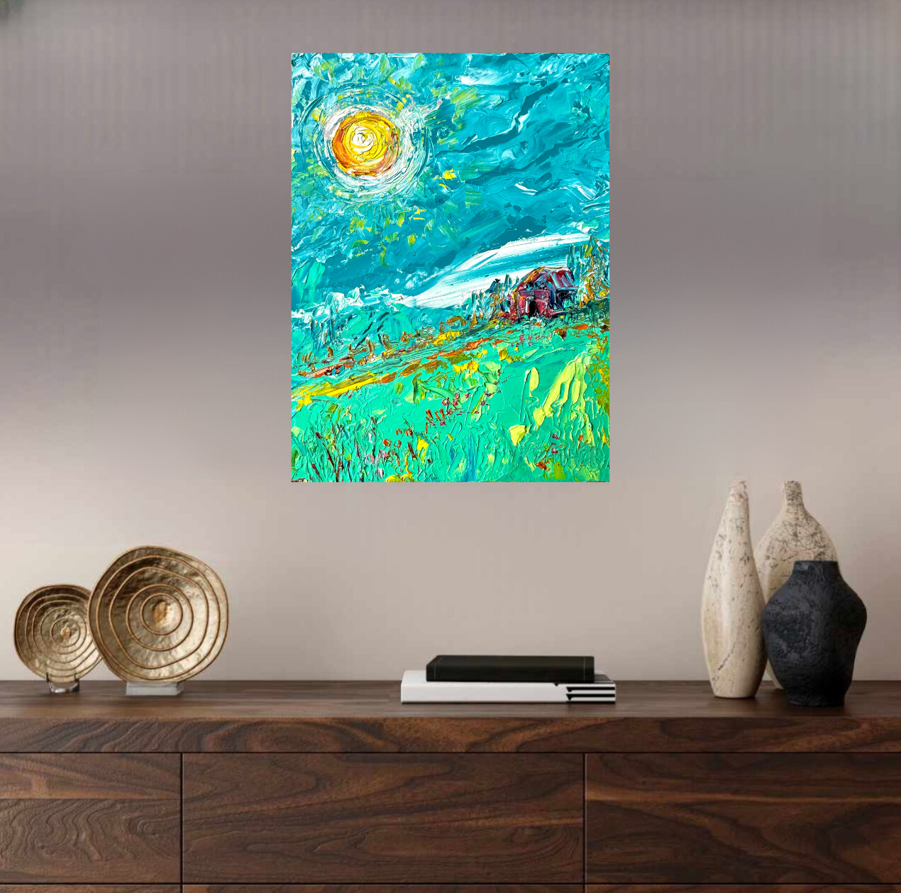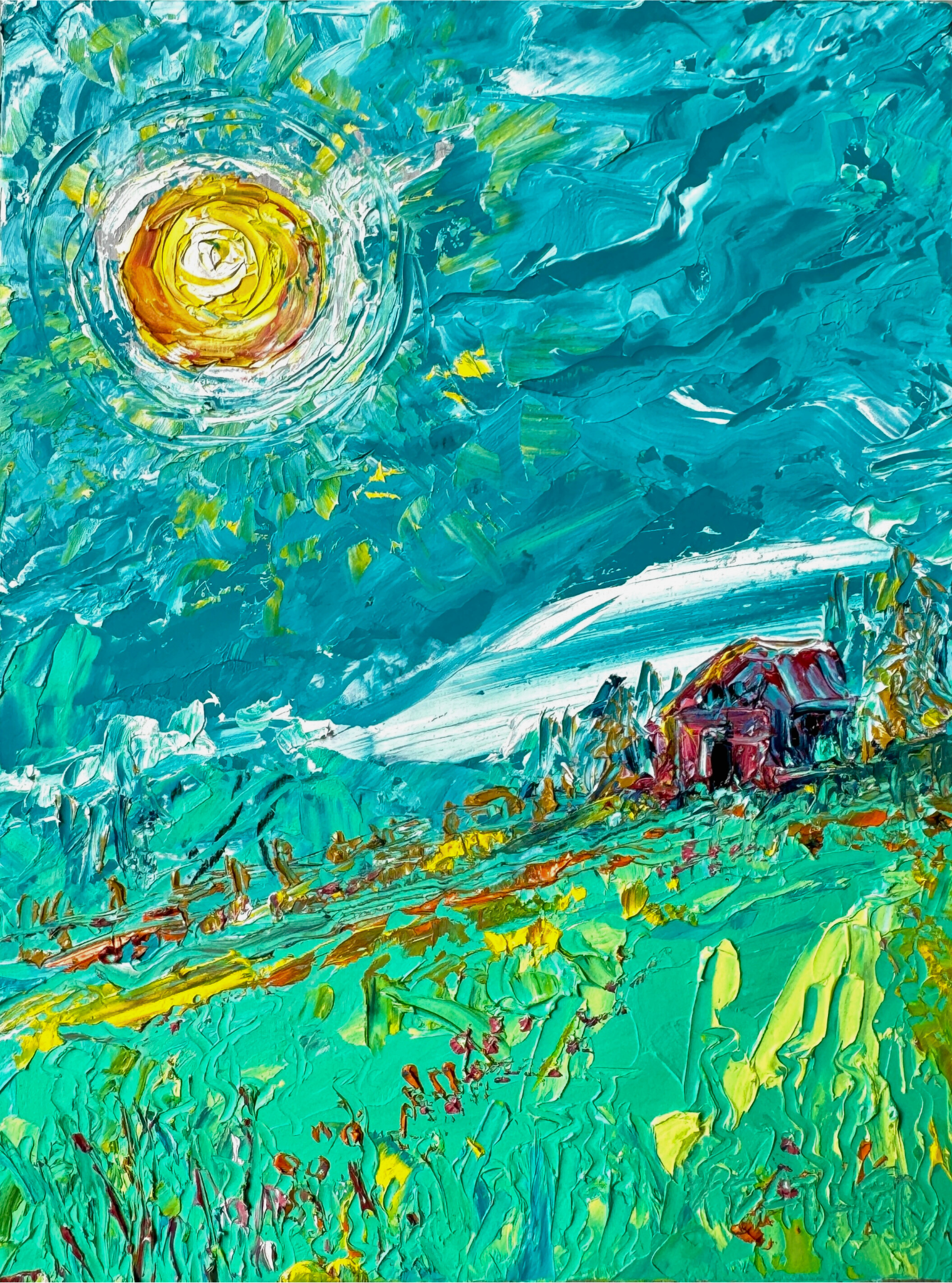 Wisps of cloud and sun swirl above a barely-there barn, tucked safely among the trees. Hints of life—a fence, soft seafoam grass—breathe quiet into the scene, sacred in its stillness. Painted during a rare pause, thanks to my art assistant Shaina who took the reins, this piece is a gentle exhale—born from rest, gratitude, and light.