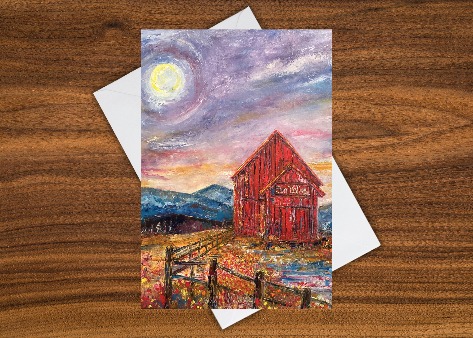 In this vibrant reimagining of the iconic Sun Valley Barn, this piece takes a bold departure from traditional color theory, where the rules are bent in favor of pure playful expression. A burst of purple, red, and pink collide with warm yellows and oranges, while mountains of teal add an unexpected cool twist. A swirling sun, its rings of light radiating outward, fills the sky with energy, while the fence line and flowers add depth to the scene.