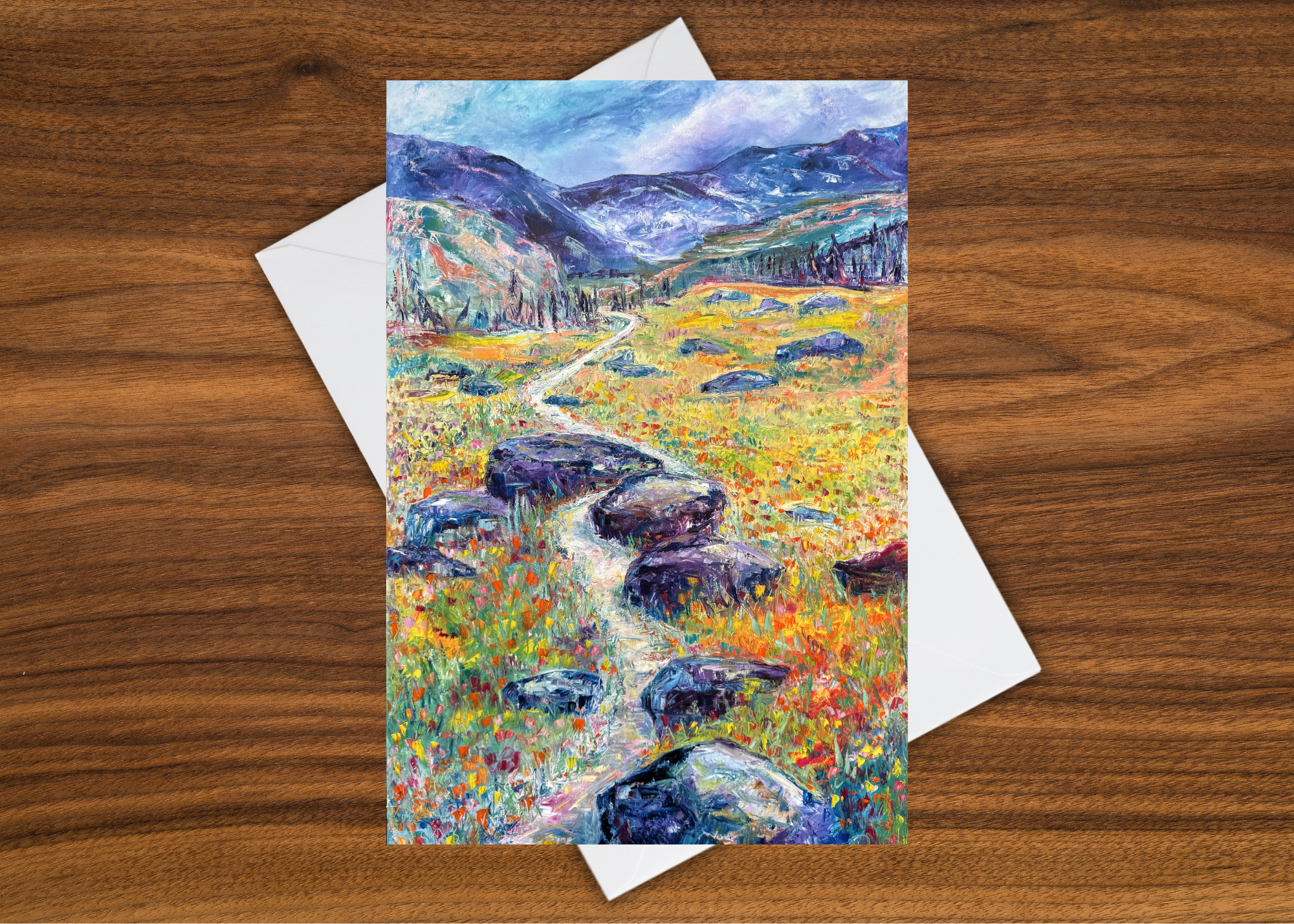 A long, winding path leads the eye — and the soul — through a field bursting with wildflowers. Flanked by rugged stones like ancient sentinels, the trail carves its way toward distant, majestic lavender mountains. This piece hums with the spirit of the American West — untamed, beckoning, and wide open.